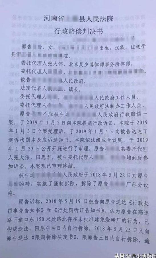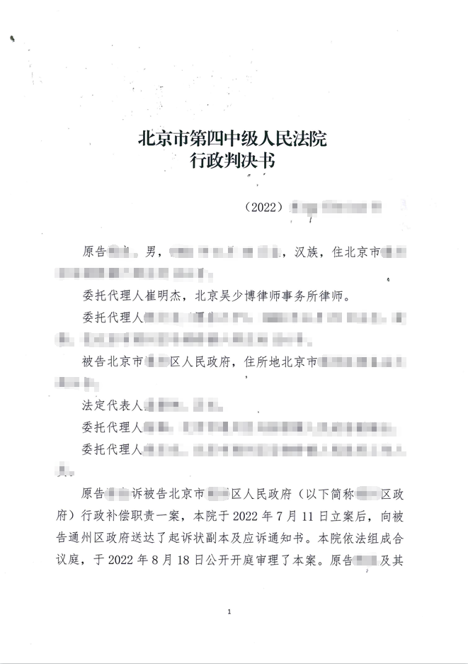 本案代理律師:北京吳少博律師事務所吳少博律師、石磊律師 本案事實 被告TS區政府于2019 年