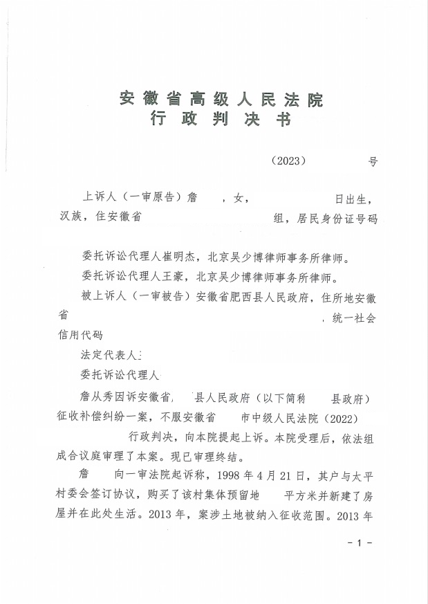 本案代理律師 北京吳少博律師事務所崔明杰 案情簡介: 1998年詹女士一家于安徽省某縣安家,
