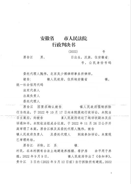 本案代理律師 北京吳少博律師事務所隗偉 案情簡介: 安徽省某市的江某,曾在村子內修建了